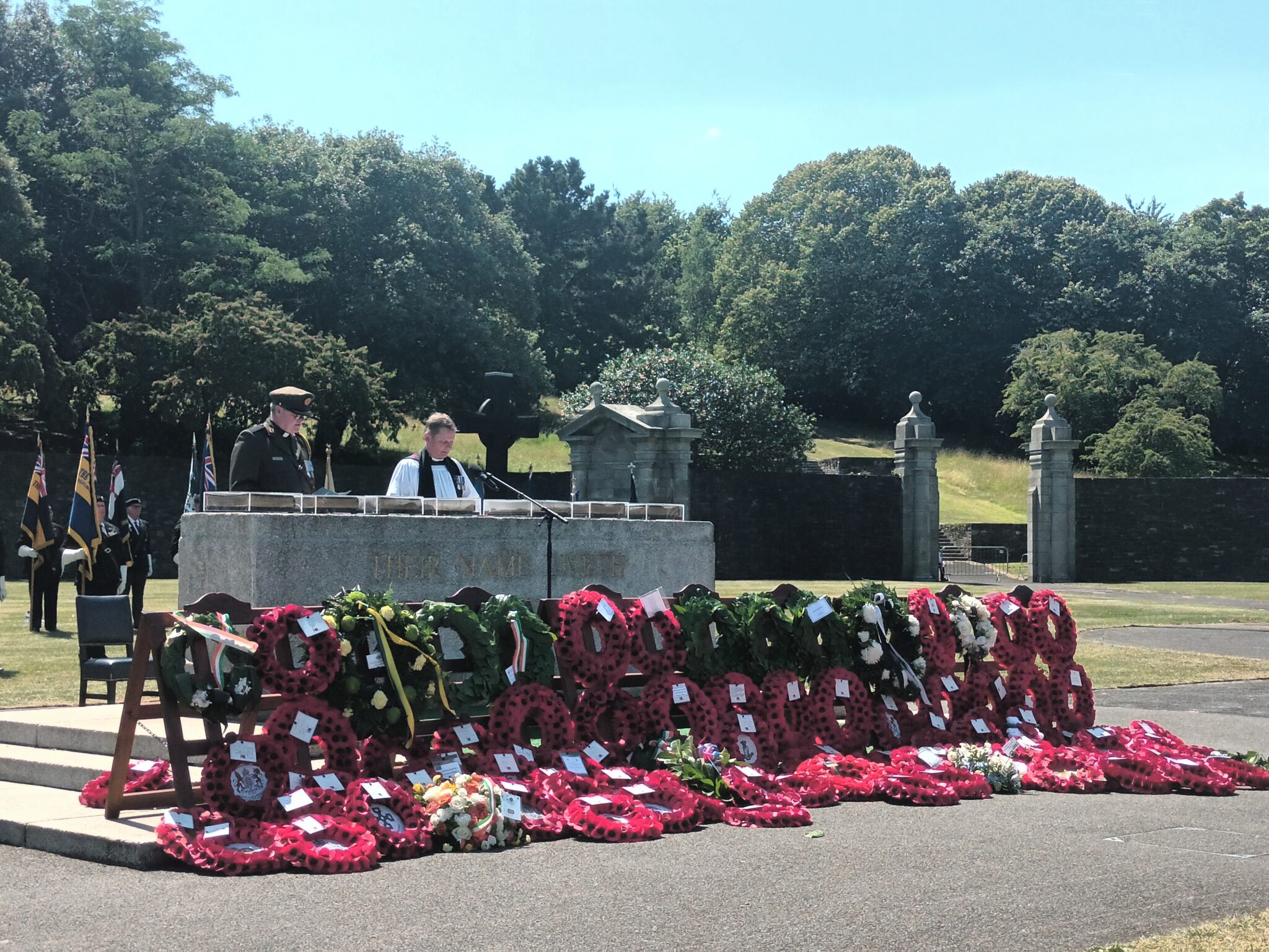 Under the direction of Mr Paul Stephenson, District Chairman, the Lords Mayor, Ministers, Ambassadors, Defence Forces, An Garda Siochána, the Judiciary, Royal British Legion, Regimental and Veterans Associations, and relatives laid wreaths at the War Stone.