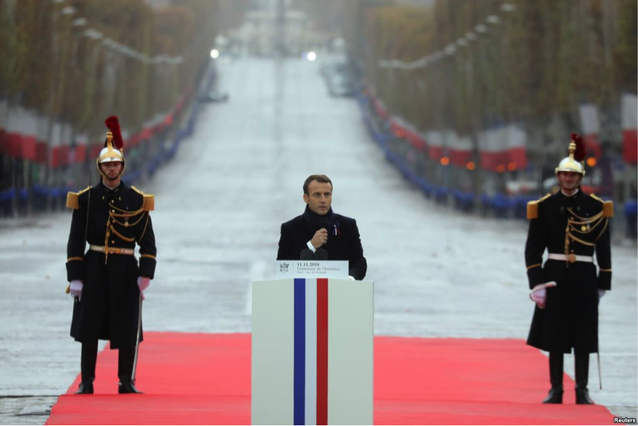 President Macron warned against the dangers of nationalism and said the “ancient demons” that caused World War 1 and millions of deaths are growing stronger.