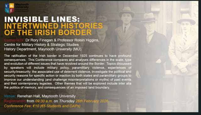 An Academic Conference will be convened, in Renehan Hall, Maynooth Universit, by Dr Rory Finnegan and Professor Roisin Higgins to discuss – “Invisible Lines: Intertwined Histories of the Irish Border”,