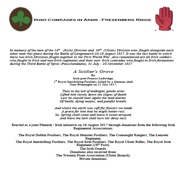 On Friday, 18th August 2017, a bronze memorial was unveiled on Frezenberg Ridge to commemorate the men of the 16th (Irish) and 36th (Ulster) Divisions who fought and died attacking German redoubts along the ridge.
