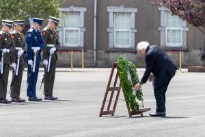 The President laid a wreath on behalf of the people of Ireland at the Commemorative Plaque. This was followed by a period of one minute’s silence terminated by the firing of a 25 Pounder Gun Howitzer deployed by the 1 Brigade Artillery Regiment. Military honours were rendered by the Cadet Guard of Honour, with instrumentalists from the Band of 1 Brigade sounding the Last Post and Reveille.
