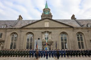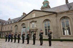 President Higgins received the Presidential Salute from a Captain’s Guard of Honour under the command of Captain Patrick Fitzgerald 1 Brigade Artillery Regiment, which was drawn from the three components of the Defence Forces namely the Army (1 Brigade Artillery Regiment), Naval Service and Air Corps.