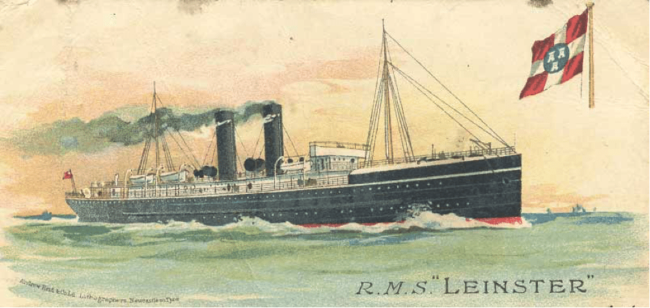 Build by Cammell Laird of Birkenhead in 1897, RMS Leinster was a 3,069 ton packet steamship with a service speed of 23 knots, driven by two independent four cylinder triple expansion steam engines.
