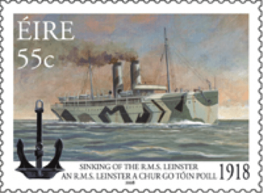 The ship’s crew was drawn from Kingstown and Holyhead. Civilian passengers came from many parts of Ireland and Britain. The majority of passengers that day were, however, military (and naval) personnel. They came from Ireland, Britain, the United States, Canada, France, Australia and New Zealand. Approximately 150 of those who died on RMS Leinster are buried in Grangegorman Military Cemetery. On 30 May 2008, An Post (The Irish Post Office) issued a stamp to commemorate the 90th Anniversary of the sinking of RMS Leinster. All but one of the 22 Postal Sorters on board perished.
