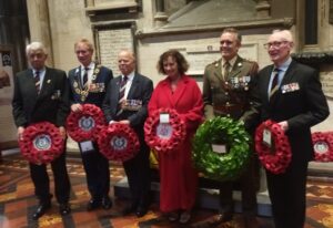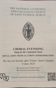 The Choral Evensong was led by The Reverend Charles Mullen, Dean Vicar of St Patrick’s Cathedral, and sung by the Cathedral Choir (Lay Vicars Choral). The First Lesson was read by Colonel Anthony Corcoran Director Defence Forces Medical Branch. Lieutenant-Colonel Gillian Bingham, RAMC Association (Ulster Branch) read the Second Lesson.
