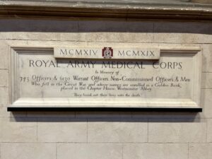 In 1922, four identical memorials were placed in Westminster Abbey, St Giles Cathedral in Edinburgh, St David’s Cathedral in Wales and in St Patrick’s Cathedral in Dublin. The names of the 6,783 personnel of the Royal Army Medical Corps fell in the Great War are enrolled in the Golden Book in the Chapter House, Westminster Abbey. Ireland provided more than its fair share, as graduates from all the medical schools on the island served with the Royal Army Medical Corps.