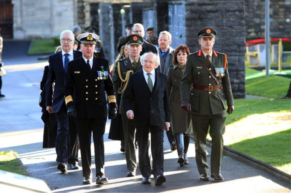 The day’s events commenced at 1000hrs with the unveiling of five Commemorative Plaques in honour of Irish men who received the Victoria Cross for their acts of bravery in World War One, including the last Irish person to be awarded a VC before the Armistice. This was followed by the State commemoration at 1000hrs. The State commemoration was attended by Uachtarán na hÉireann tofa Michael D Higgins, Minister for Culture, Heritage and the Gaeltacht Josepha Madigan TD, and representatives of 47 countries.