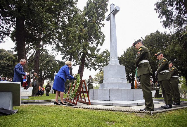 Prince Charles and Minister Humphries laid wreaths at the Cross of Sacrifice and the Necrology Wall, that lists the names of 488 people killed during the 1916 Rising, including 268 civilians, 119 British Army soldiers, 63 rebels and 40 children.