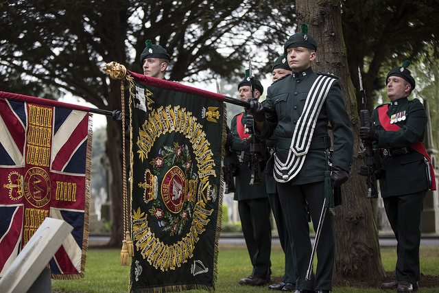 Colour Parties were provided by the Defence Forces and the Royal Irish Regiment. The Honour Guard was drawn from the 2 Cavalry Squadron and musical honours were rendered by the Army Number Band. Pipers Laments were played by pipers from both the School of Music and the Royal Irish Regiment.