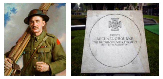 Michael O’Rourke was born in Limerick, Ireland on 19 March 1878. Before emigrating to Canada, he served for seven years with the Royal Munster Fusiliers. On arrival in Canada, and working as a hard rock miner and logger, he served with the 104 Regiment, Westminster Fusiliers of Canada. At the outbreak of the First World War, he enlisted as a private in the 7th (1st British Columbia) Battalion in the Canadian Expeditionary Force, as a stretcher bearer.